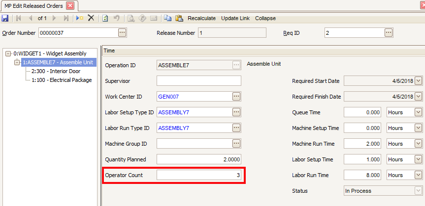 NOTE: In the Operations setup/maintenance screen, the BOM item setup/maintenance screen, and the Edit Released Order function, if the total labor time (labor setup time + labor run time) > 0, the operator count must be greater than 0.