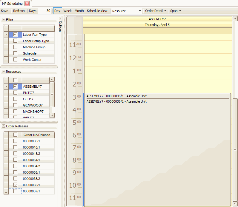 We place an order to produce two widgets. We know that we will have 2 hours of machine time and 9 hours of labor time (labor setup time + labor run time). When we look at the schedule, we see that our production order is going to take 9 hours to complete. As shown using our example, our production order will run from 3 PM to Midnight. Note that the 4 operators defined for the ASSEMBLY7 operation are not being considered during scheduling.
