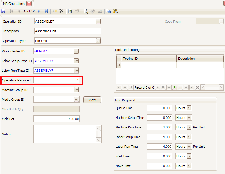 We set up the BOM with the ASSEMBLY7 operation, which shows us 1 hour of machine time, 1 hour of labor setup time, and 4 hours of labor run time to account for the 4 operators on the Operations screen. This is illustrated below.