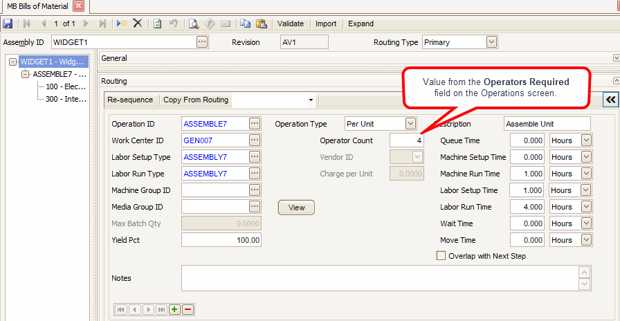 When creating a new BOM, the value from the Operators Required field on the Operations screen will default into the Operator Count field in the Routing section of the BOM. The multiple operators feature presumes that the amount of time each operator uses to perform the labor setup and the labor run is the same.