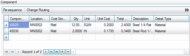 The Component section lists the materials (raw and purchased) and recipes required for the associated routing step. The components are listed when the associated routing step is selected in the routing section or in the bill of materials hierarchy tree.