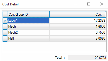 Click the Cost button to open the Cost Detail screen to view the calculated costs for each cost group used in this bill of material.