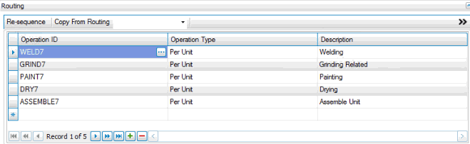 - Select an Operation ID from the drop-down list. You create the operations available in the drop-down list via the Operations maintenance function on the MFG-Routing and Resources Setup and Maintenance menu. By choosing the operation ID, you can pull a predefined operation consisting of a work center, labor type, and machine group, as well as any preset time defaults. One may want to think of the operation ID like a template. The operation ID itself is not as important as the information it pulls in from predefined operations.