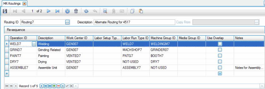 Continue adding steps to the routing as needed by using the Append button (  ). If you are adding a step between two existing steps, add the step and then drag it to the desired location and drop it. Click Resequence to resequence the steps in the new order you set. ). If you are adding a step between two existing steps, add the step and then drag it to the desired location and drop it. Click Resequence to resequence the steps in the new order you set.