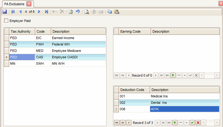 - Select the Employer Paid check box, if applicable, to exclude earnings and deductions from employer-paid taxes. Leaving the check box clear applies the exclusion to the employee.
