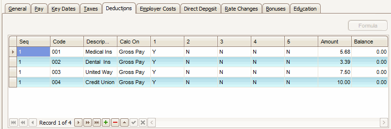 Use the Deductions tab to specify employee deductions for the employee and how the deduction will be calculated.
