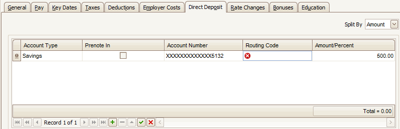 Use the Split By field to select whether to divide the employee's net pay by None, Amount, or by Percent. If you select None the employee will only receive a pay check.