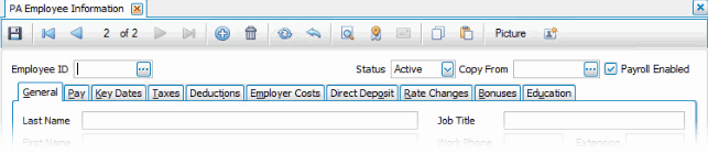 Use the Pay tab to set up salary information for employees and to set up valid earning codes for employees. They are required for entering Payroll Transactions.