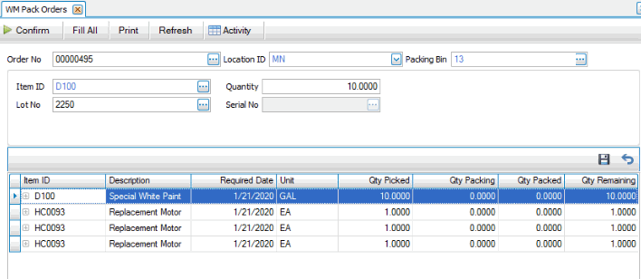 After you release the orders you are going to fulfill and pick the items for the order(s), use the Confirm process in the Pack Orders screen to record the item IDs you pull from inventory and apply their quantities to specific transactions.