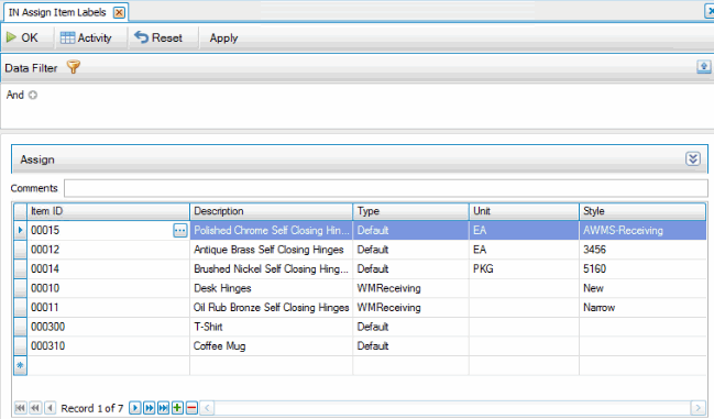 To see current label assignments, enter criteria in the Data Filter if necessary, then use the Apply button. All current item label assignments that meet the data filter criteria will display in the grid.