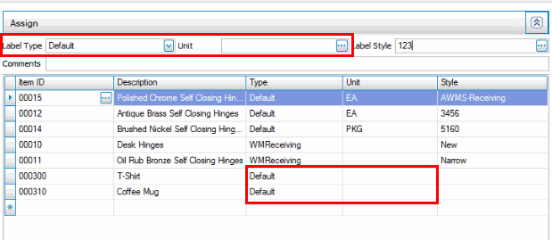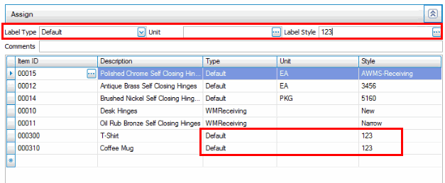 Alternately, use the Assign Labels button on the toolbar of the Item maintenance, Item Labels, and Receiving Labels functions to open the Assign Item Labels screen.