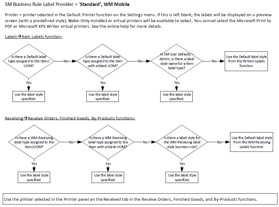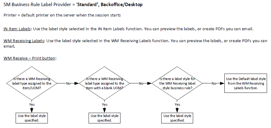 When printing labels, the system will use the label style you assign to an item/UOM in the IN Assign Item Labels function. If you do not assign a label style to an item/UOM, the system will use the defaults you select in the label maintenance screens or the defaults you set in the SM User Defaults - Admin function. The label style and label printer the system will use for an item/UOM depends on both business rule settings and defaults set up in the SM User Defaults and SM User Defaults - Admin functions.