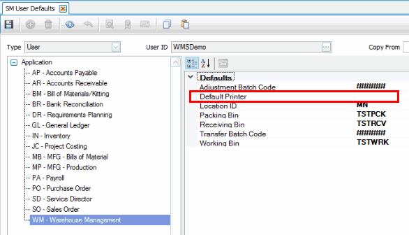 Use the SM User Defaults and the SM User Defaults - Admin functions to select default label printers for Warehouse Management.