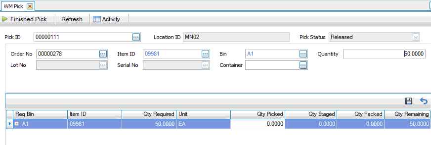 Use the Pick function to record the items you are going to pick from inventory and apply the quantities and bin information to the order transaction. Pick items from their storage bin(s) and move them to a packing bin from which they are packed and shipped.