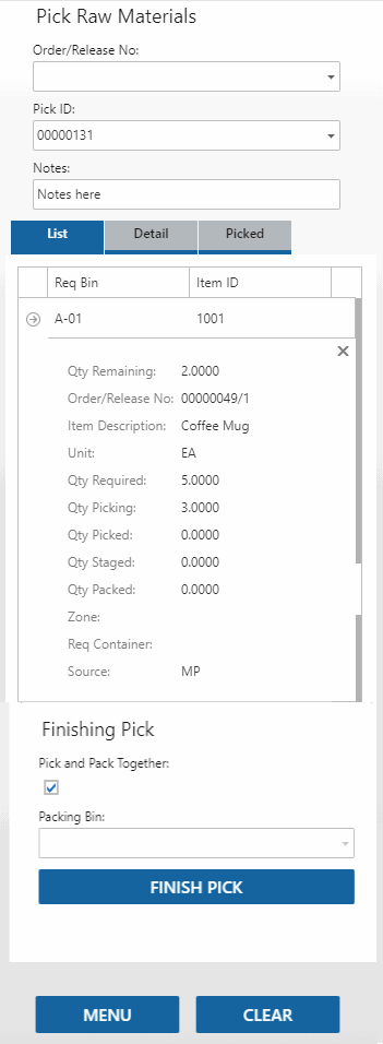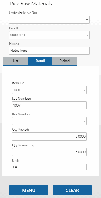 On the List tab On the List tab  Tap the line item you want to pick. The Detail tab will open and allow you to enter the item information. Alternately, open the Detail tab and enter or scan the item you are issuing to the production order.