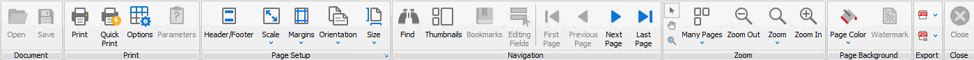 The generated report preview includes a ribbon bar that is divided into multiple sections. Use the following buttons to perform the described functions.