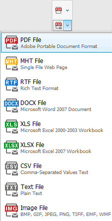| E-Mail As ... | Email the report as a file attachment in one of a number of formats: PDF, MHT, RTF, DOCX, XLS, XLSX, CSV, TXT, or Image. The system will use the default email application. |
