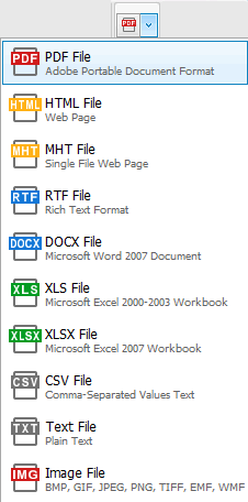 | Export To ... | Save the report as a file in one of a number of formats: PDF, HTML, MHT, RTF, DOCX, XLS, XLSX, CSV, TXT, or Image. |