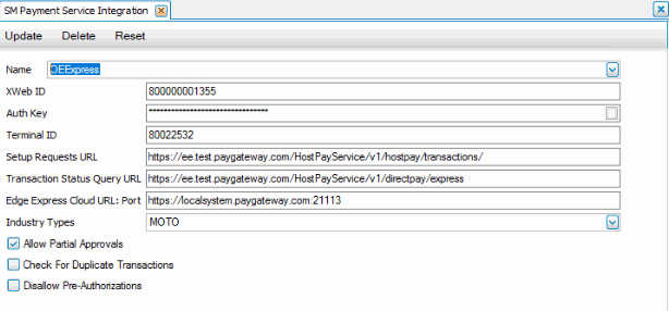 - Enter the URL for the payment processing service in the Edge Express Cloud URL:Port field.