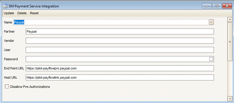 - Use the Update button on the toolbar to update the payment service settings with the values you entered/edited.