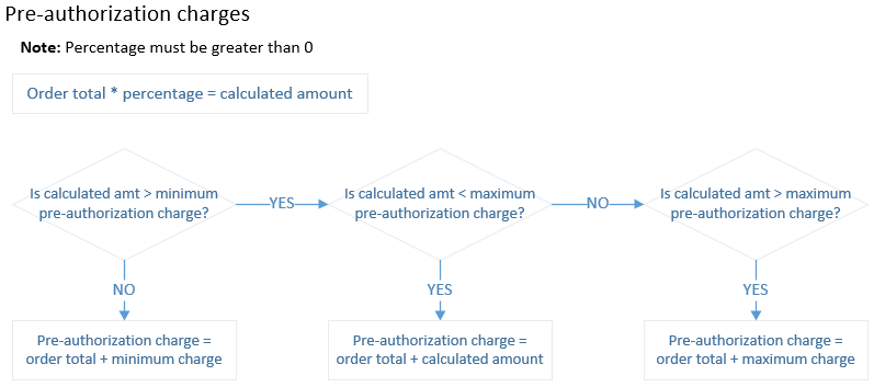 The process takes the order total and calculates the percentage of the total (calculated amount). That calculated amount, along with the minimum and maximum charges, determines the pre-authorization amount.