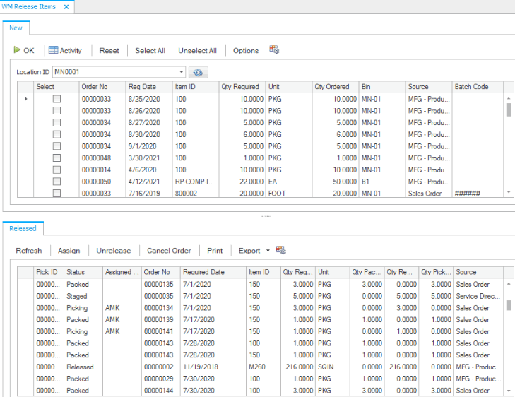 The Release Items function is the starting point of the Warehouse Management System's (WMS) order fulfillment process. This function collects item and quantity information from Sales Order, Production, Service Director, Project Costing, and WMS transfers and material requisitions for all transactions that are due to be picked and shipped. After you build a list of the orders you need to fulfill, you can print a picking list and pull items from inventory.