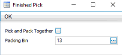 - Once you have picked the entire amount of items required, click Finished Pick on the toolbar to open the Finished Pick window. If the Pick and Pack Together check box is checked, the picking, moving, and packing actions are finished in one step without hitting a packing bin.