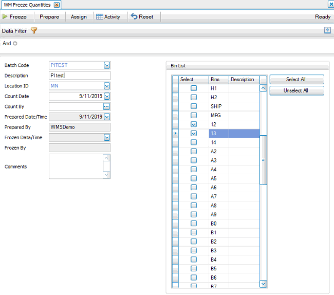 - Select the bin numbers to include in the batch in the Bin List section. Use the Select All button to mark all the check boxes, or the Unselect All button to clear all the check boxes.