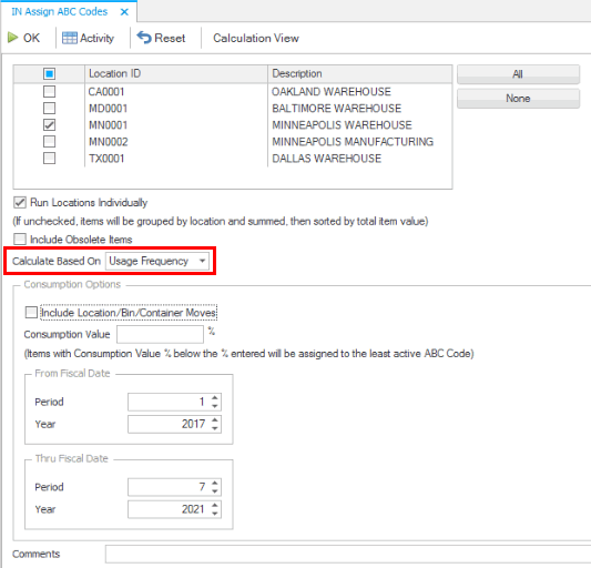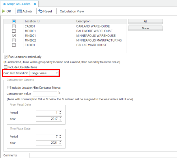 We are assigning ABC codes calculated based on 'Usage Value' with a time frame selected. Usage indicates consumption. and looks at transaction history within the specified period of time. The transaction types considered for consumption include Material Requisitions, MP Build Component, AR Invoice, SO Verify, SO Invoice, IN Verify, IN Invoice Sale, BM Build Component, BM Unbuild Assembly, WM Material Requisitions. When you include location/bin/container moves, the transaction types also include Transfer From, WM Transfer From, and Move Out.