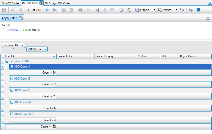 Note: In our example, the total number of items to be assigned an ABC code in the MN location is 132.