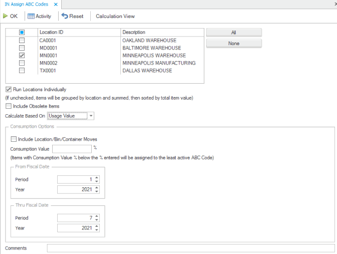 When you enter a Consumption Value percentage, all items with a total value percentage less than the consumption value percentage are assigned to the least-active ABC code.