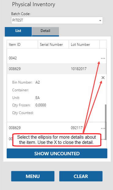 - On the List tab, select the item you are counting. The Detail tab will open and allow you to count the item. Alternately, open the Detail tab and scan or enter the Item ID you are counting.