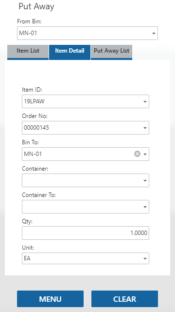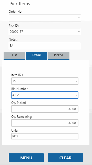The Detail tab will open and show the item, bin, and unit of measure for the item. The container, lot number, and/or serial number will be visible if applicable. Scan or enter the Bin Number and/or the Qty Picked, as necessary.