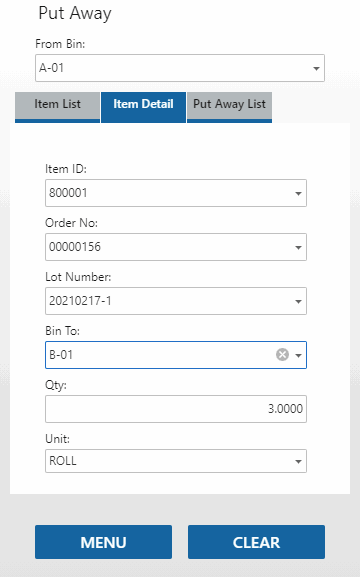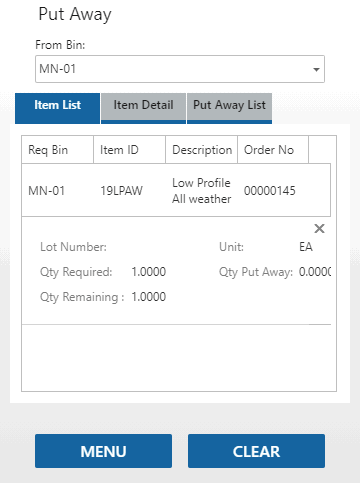 Tap a record to open the Item Detail tab for the put away process.