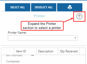 The default label printer for the item will be used. If you want to change the label printer, expand the Printer section and select a different printer from the drop-down list. The available printers are those installed on the server that hosts Mobile WMS.