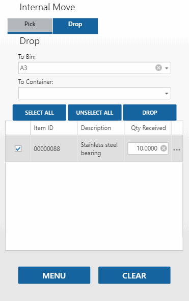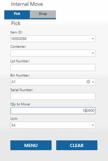 On the Drop tab, enter the destination bin in the To Bin field, and the destination container in the To Container field as available and necessary.