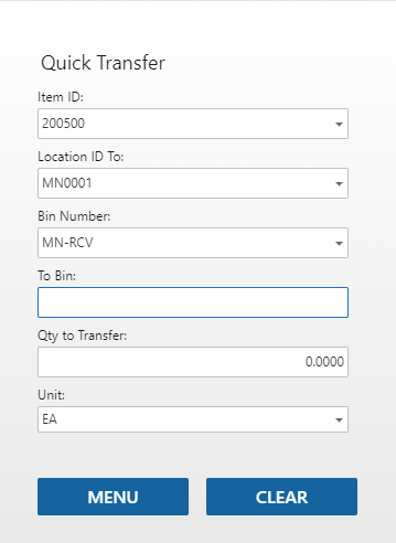 On the Quick Transfer screen, scan or enter the item, destination inventory location, source bin number, source container, lot number, and/or serial number, as available and applicable.