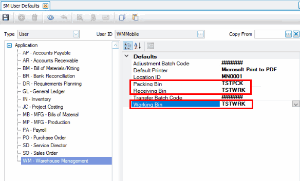 Use the User Defaults function on the SM Company Setup menu to assign default receiving, packing, and working bins.