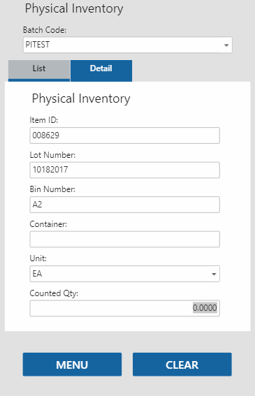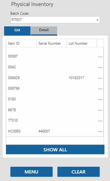 For each item on the List tab, select the item. The Detail tab will open, allowing you to scan or enter the appropriate information into the fields on the Detail tab. The List tab gives you the option to show all items or just the items that do not have a counted quantity.