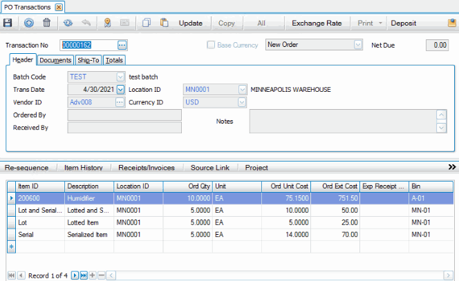 Because one item is serialized, one is lotted, and one is lotted and serialized, you will have to enter serial numbers and lot numbers for each item as required.