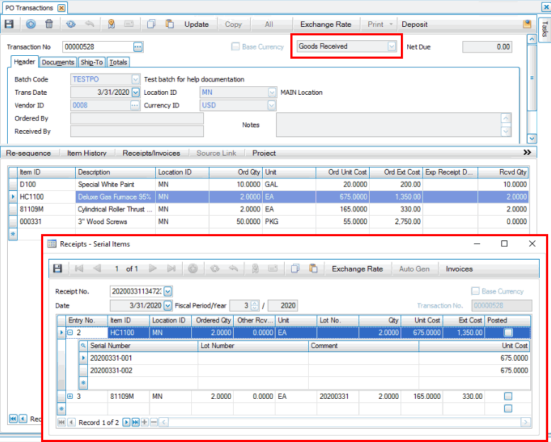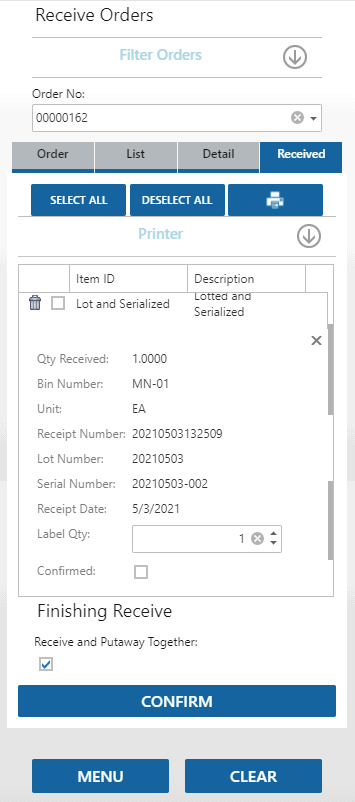 Receive the item that is both lotted and serialized by following the same process, entering the lot number as well as the serial number as required.
