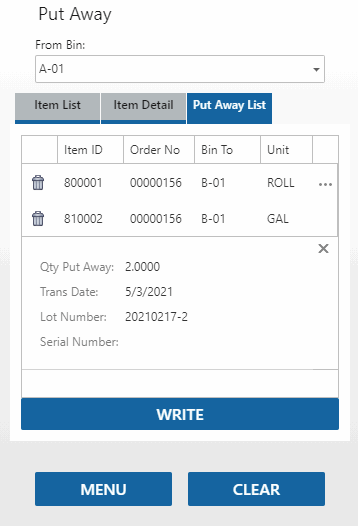 Once you have all the finished goods you want to put into inventory on the Put Away List tab, tap Write to finish the process.
