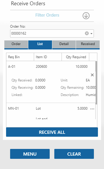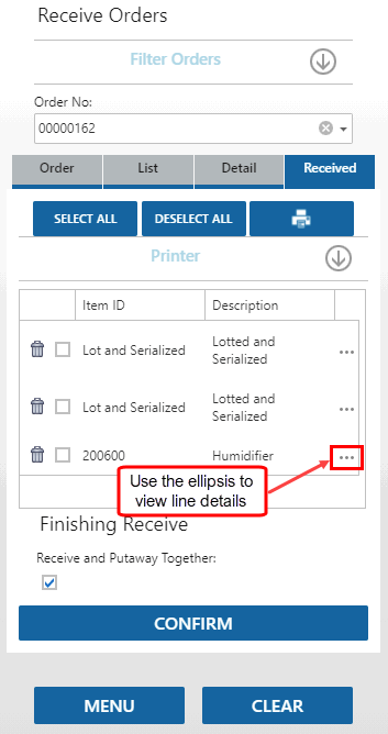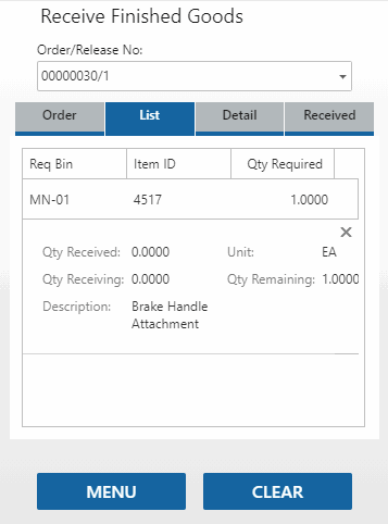 The Received tab will list the finished good(s) you have received during the session. To view details for an item, use the ellipsis to expand the line.