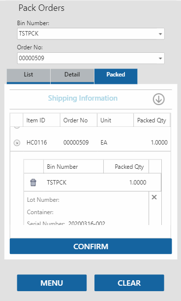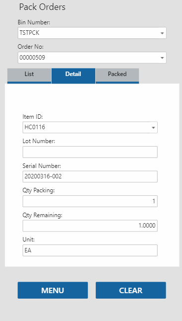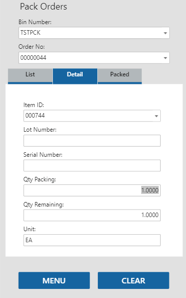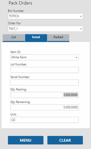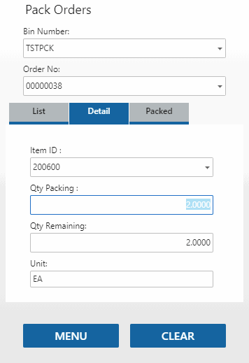 Select an item to pack/issue. The Detail tab will open. Enter the quantity of items you are issuing/packing in the Qty Packing field, then tab out of the field. The item will be added to the list on the Packed tab.