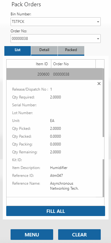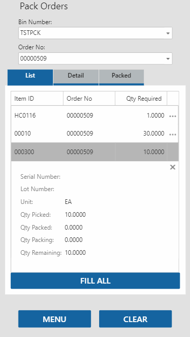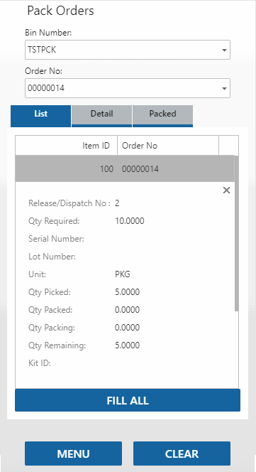Select an item to pack/issue. The Detail tab will open. Enter the number of items you are issuing/packing in the Qty Packing field, then tab out of the field. The item will be added to the list on the Packed tab. Alternately, use the Fill All button to pack/issue all items at once.