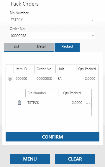 If the Pick and Pack Together business rule is set to 'No', or you left the Pick and Pack Together check box clear, pack the items for the sales order using the Pack function on the Pick/Pack/Ship menu. Scan or select the Order No for the order you are packing. The items on the packing list will appear on the List tab. Notice the Pack function looks in your default packing bin for the items to pack.