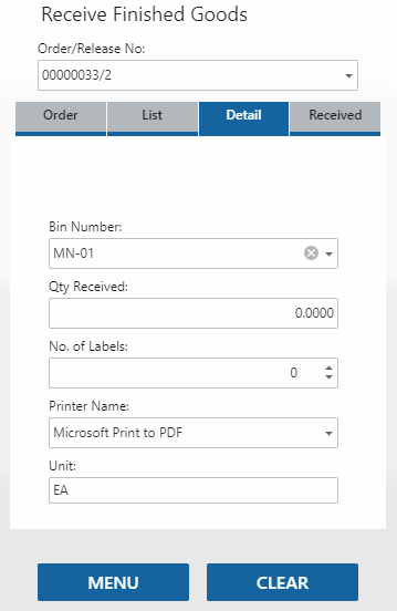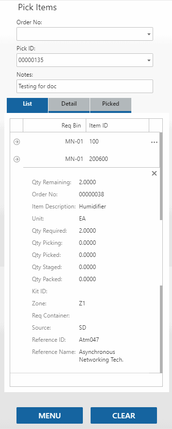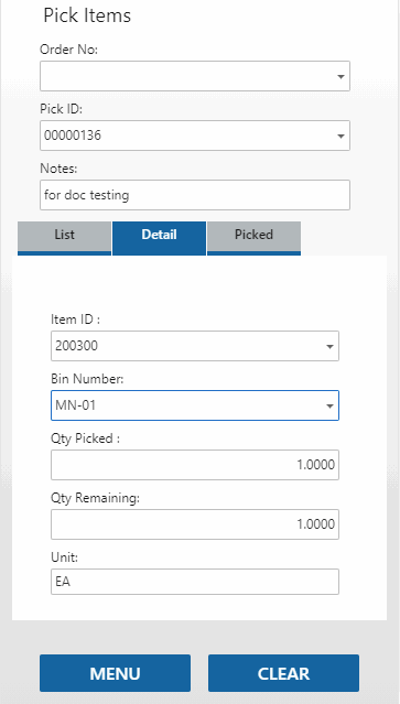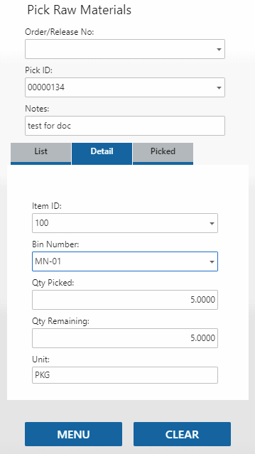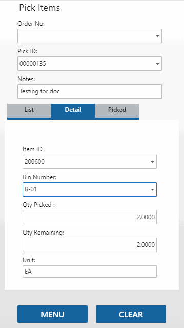 The Detail tab will open and show the item, bin number, and unit of measure for the item. If applicable, the container, lot, and/or serial number fields will be visible. Scan or enter the Bin Number and/or the Qty Picked, as necessary.