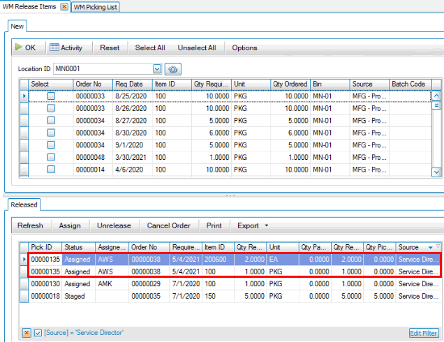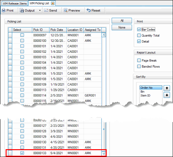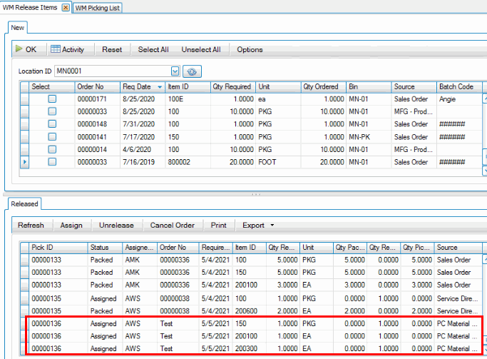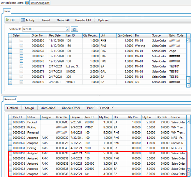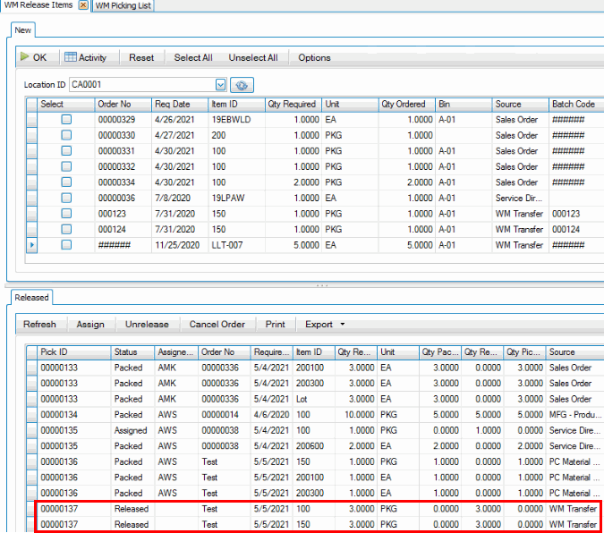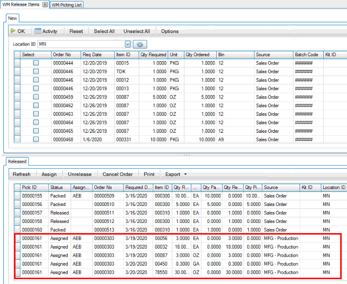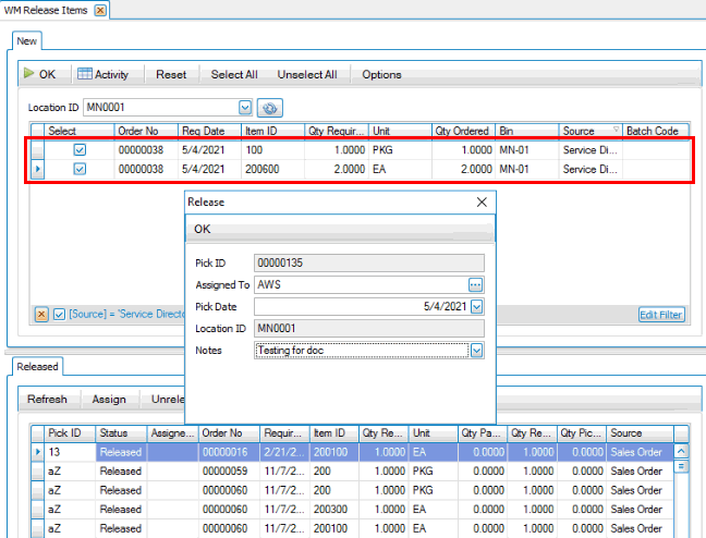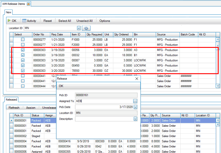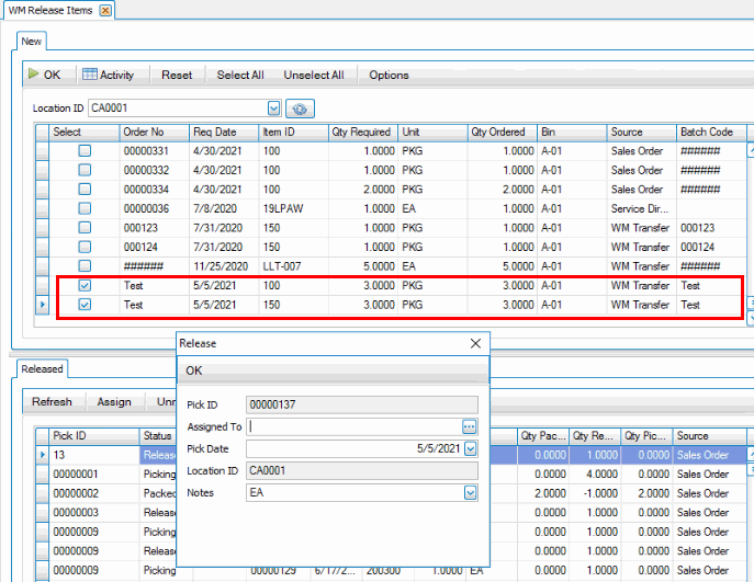 Next, on the desktop client, use the Release button on the SO Orders screen or use the Release Items function on the WM Daily Work menu. Releasing the items creates a pick ID you can use to print a picking list.
