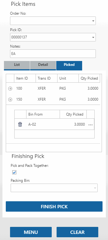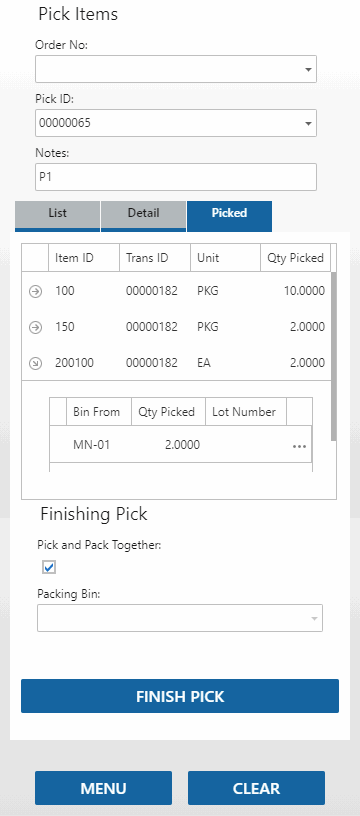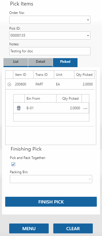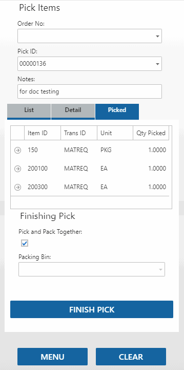 - In the Pick Items function, on the Picked tab, when you select 'Pick and Pack Together', a packing list will print when you tap Finish Pick.