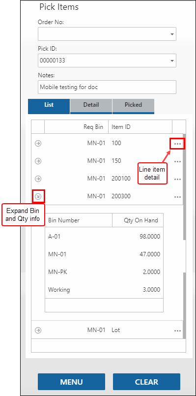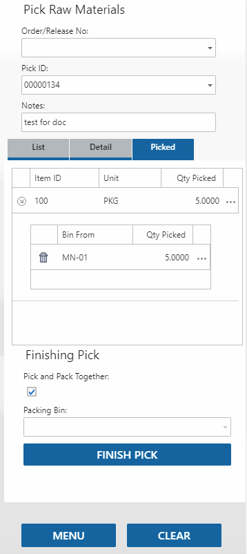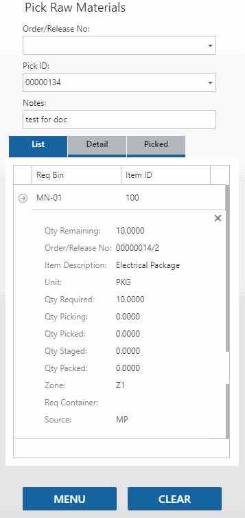 Pick the raw material items for the production order using the Raw Material pick function on the Pick/Pack/Ship menu. Scan or select the Order/Release No or the Pick ID. The items on the picking list will display on the List tab. Use the ellipsis to view line details. Use the X to collapse the details. Use the expand arrow to view bin and quantity information.